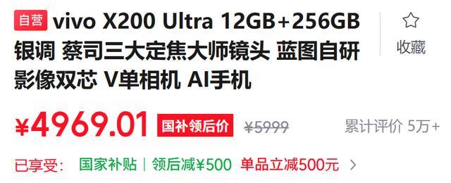 vivo X300 Ultra(6999元起)不支持国补,vivo X200 Ultra国补后不到5000元就能拿下,直接立省近2000元。